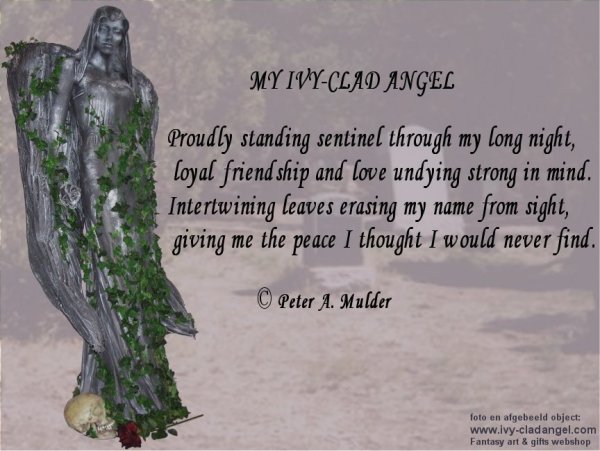 Spookachtige ouderwetse kerkhoven (die je toch voornamelijk alleen maar in Groot-Brittannië, Frankrijk en in films lijkt tegen te komen), met hun prachtige gotische mausoleums en beelden hebben mij, mede dankzij de duistere romantiek die ze uitstralen, altijd erg geboeid. Dus toen ik een object zocht, om een fantasy-winkel te vertegenwoordigen, kwam ik op dit idee. Zo is mijn winkeltje aan de naam 'Ivy-clad Angel' gekomen!