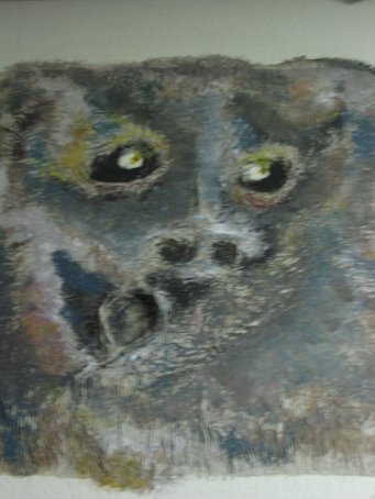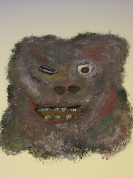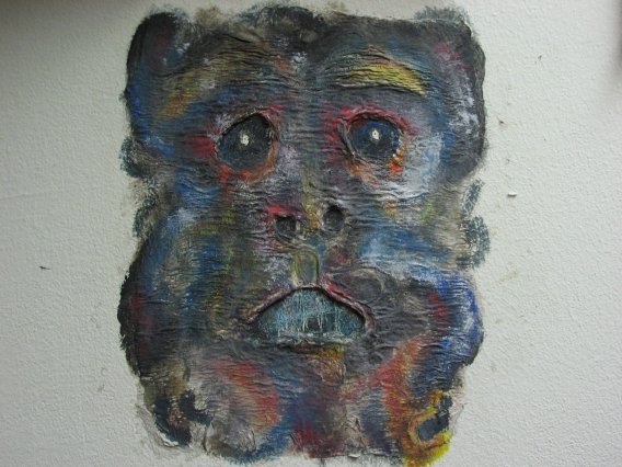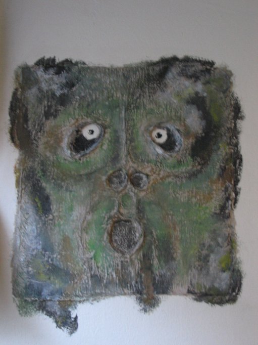 THIS 'WALLMONSTER' HAS BEEN SAFED (BY A LICENSED ESSENCE HUNTER) FROM AN OLD (CONDEMED TO BE DEMOLISCHED) BUILDING, AND "GIVEN FORM" BY LURING HIS ESSENCE INTO A PIECE OF CARDBOARD. (THIS PROCESS CAN BE DANGEROUS, PLEASE DO NOT TRY THIS AT HOME!!) NOW DORMANT, THE CREATURE IS PERMANENTLY VISIBLE AND CAN BE, DECORATIVELY, HUNG ON ANY SPOT ON THE WALL YOU LIKE. (DAMP PLACES ARE STRONGLY ADVICED AGAINST!) IT MUST BE NOTED THAT IF, IN THE LONG RUN, THE IMMAGE DISAPPEARS, THE WALL MONSTER HAS PROBABLY AWOKEN FROM HIS DORMANT STATE TO ENTER THE WALL ITSELF, THUS TAKING UP HIS JOB AS ONE OF THE PROTECTORS OF YOUR HOUSE.