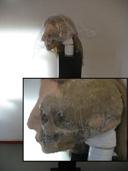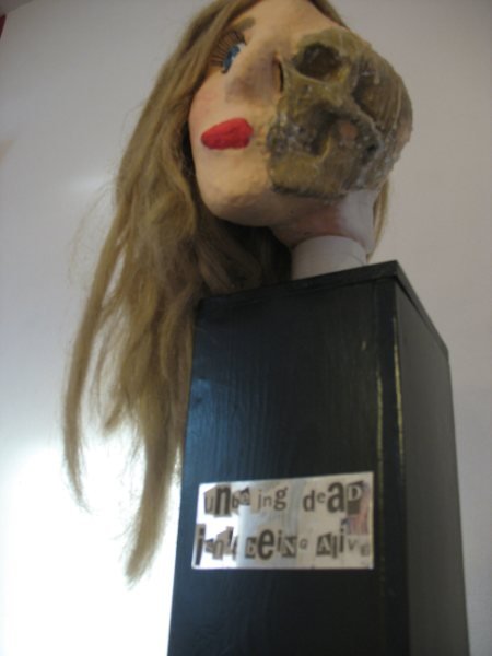 Mensen genieten tegenwoordig niet meer van het leven. Ze houden zich als maar bezig met wat anderen van hen denken en zitten 'klem' in een hokje waar ze niet uit kunnen komen. Juist doordat ze zich hier zo veel mee bezig houden, zijn ze langzaam aan het doodgaan. Dit terwijl ze iets van het leven moeten maken! Voor de buitenwereld willen ze er gelukkig uit zien. Daarom ziet de linkerkant van het werkstuk er stralend en gezond uit, terwijl de rechterkant al aan het doodgaan is. Deze vervaagt langzaam en is aan het afbrokkelen (zie ook het kaarsvet). Het hokje om het gezicht heb ik gemaakt van houdbaarheidsfolie, omdat mensen als het ware ook een houdbaarheidsdatum hebben (de tijd tot ze dood gaan). Het gezicht staat op een sokkel, omdat mensen als het ware tentoongesteld worden. Het zijn een voor een pronkstukken of juist missers. Ze worden beoordeeld en bekeken. De letters van het naamplaatje heb ik van krantenletters gemaakt, omdat onze vooroordelen voortkomen uit beelden en teksten uit de media (de krant bijvoorbeeld). De boodschap is dat je vrij moet denken zonder vooroordelen. Zo zul je zelf ook minder in een hokje geplaatst worden en meer genieten van het leven!