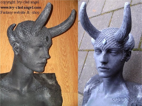 Een ring van hoorns rond haar hoofd vormt (in combinatie met de edelsteen op haar voorhoofd) een kroon de Demon Gueen waardig.